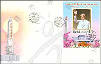 伟大领袖金日成永远和我们在一起,挥手、主题思想塔、金日成广场及花卉小型张首日封