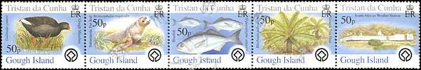 岛屿系列二—戈夫岛野生生物保护区被列为世界遗产名录10周年,世界遗产徽志、水鸡、海豹、蓝鱼、树蕨及南非气象台5联