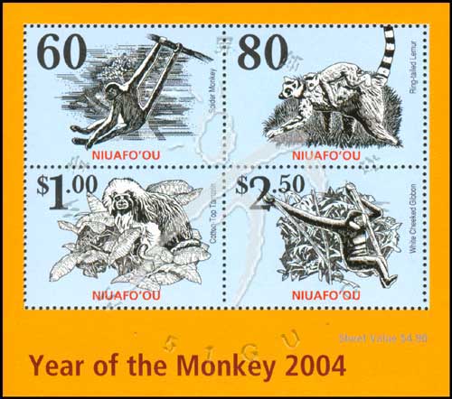 猴年生肖,蜘蛛猴、环尾狐猴、棉冠绒猴及白颊长臂猿小全张(4票)