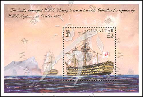 特拉法加海战200周年第一组,战后英舰“海王”号将受伤的“胜利”号拖返直布罗陀小型张