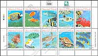 太平洋珊瑚礁鱼类,皇帝神仙鱼、小丑鱼、苏眉和镰鱼、黑斑河豚、云纹海鳝、 蓑鲉、铁头鹦哥和纹鳍蝴蝶鱼、玳瑁龟及海神喇叭鱼小版张(10票)