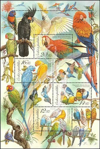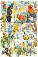 鹦鹉,虎皮鹦鹉、红牡丹鹦鹉、红领绿鹦鹉及金刚鹦鹉雕刻版小版张(4票+3枚附票)