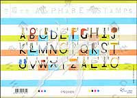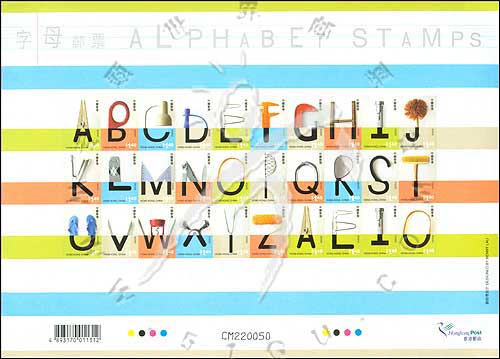 字母邮票,衫夹、较剪、台灯、白胶浆樽、蒸架、卡尺、夹钳、竹梯等日常用品表示的26个英文字母不干胶自贴票小版张(30票)