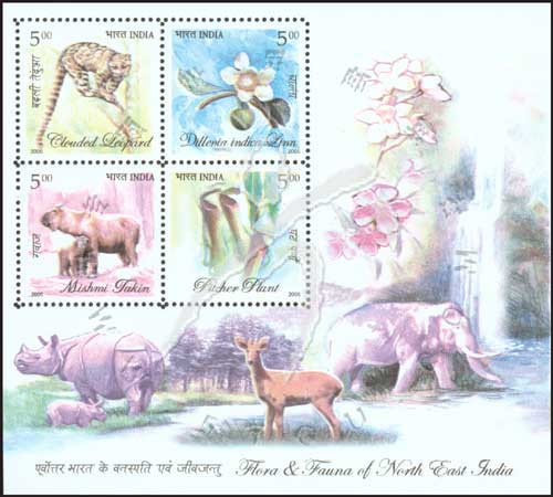 印度东北部动植物,云豹、羚牛、第伦桃、大象及猪笼草小全张(4票)