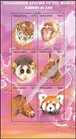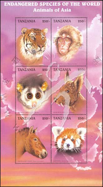濒危物种—亚洲动物,老虎、短尾猿、懒猴、麋鹿、蒙古野马及小熊猫小版张(6票)
