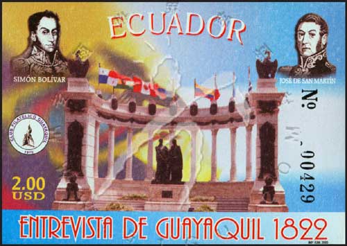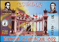 1822年圣马丁与玻利瓦尔在瓜亚基尔会师,徽志、国旗、圣马丁及玻利瓦尔肖像无齿小型张