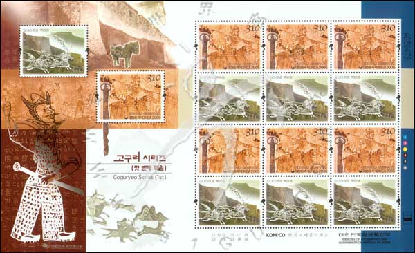 高句丽王朝系列一,古剑、地图、墓室壁画《征战图》、《狩猎图》、好太王碑及大圣要塞遗址小版张(7套共14票,带异形齿孔)