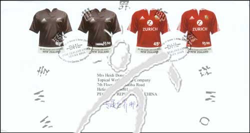 橄榄球赛,英国和爱尔兰狮队与新西兰国家橄榄球队(黑色)的运动衫、队标、阿迪达斯英文拼写及标志球衣形不干胶自贴票实寄封(我社已售缺)