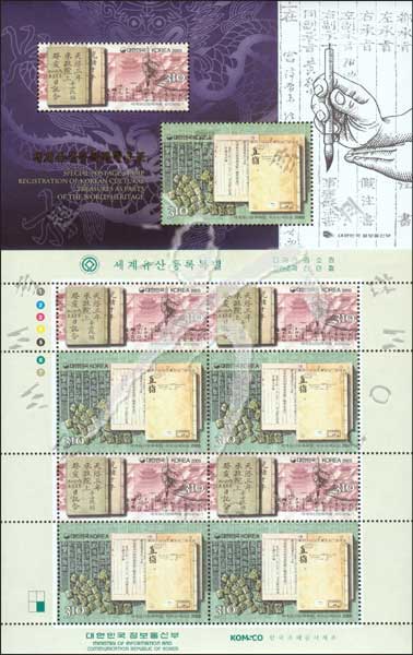 世界遗产名录中的韩国文化遗产系列九,《承政院日记》及世界上最古老的金属活字本—《直指》雕刻版小版张(5套共10票)