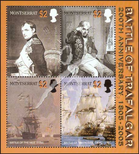 特拉法加海战200周年,拿破仑戎装像、英海军上将纳尔逊、尼罗海战场景、特拉法加海战场景及旗舰小全张(4票)