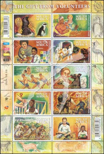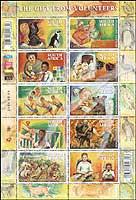 来自志愿者的礼物,教育、环境保护、照料老人和孤儿、医疗救护、收养被遗弃的小动物、帮助盲人、救火及修整花园小版张(10票,标准邮资)