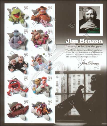 美国木偶大师吉姆·汉森逝世15周年及电视节目《青蛙柯米》首播50周年,肖像、卡通萨姆老鹰、罗勒夫狗及福兹熊等不干胶自贴小版张(11票)