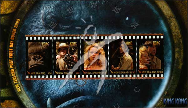 新版科幻电影《金刚》,猿人巨兽金刚、1933年黑白片的导演兼制片人卡尔·德那姆及新片中的男女主角5全邮票实寄封(我社已售缺)