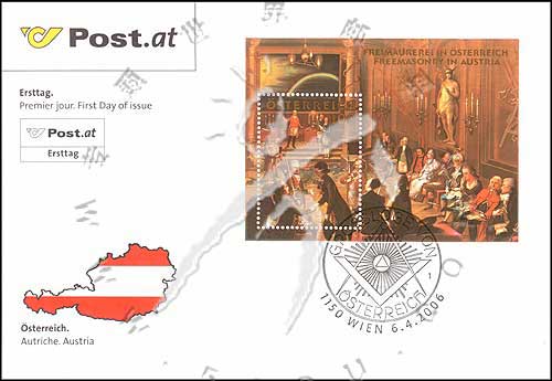 奥地利的共济会,共济会在维也纳夏日避暑玫瑰宫中聚会的场景小型张首日封