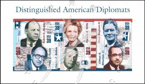 美国著名外交家,海勒姆·宾厄姆、查尔斯·波伦、菲利普·哈比卜、罗伯特·墨斐、克里夫顿·沃顿及法朗西斯.威利斯不干胶自贴小全张(6票)