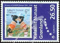 欧罗巴邮票发行50周年,2004年格陵兰发行的欧罗巴邮票(获当年最佳欧罗巴邮票称号)—身穿民族服装相互问候的女孩及大西洋冰川1全