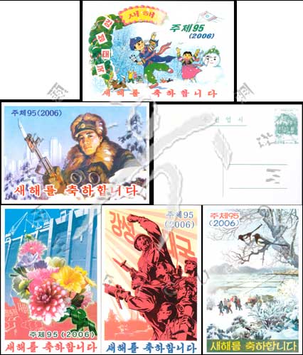 新年快乐,花卉、雪中行走、革命者、儿童放“祖国统一”风筝及堆雪人等邮资片5全
