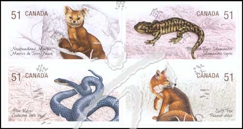 濒危动物,纽芬兰貂鼠、虎皮蝾螈、黑蛇及美洲伶狐不干胶自贴票4联