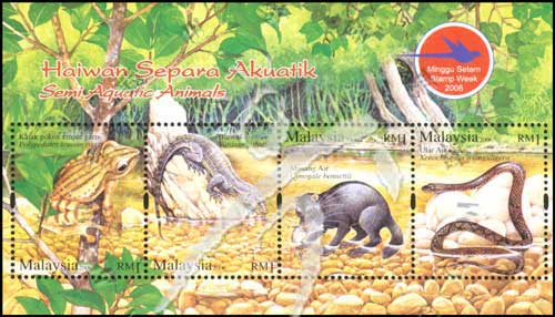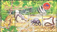 半水生动物,斑腿树蛙、巨蜥、獭灵猫及蛇小全张(4票,带异形齿孔)