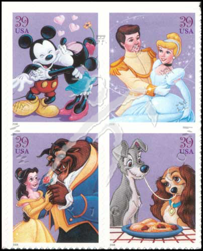 迪斯尼艺术—浪漫世界,经典爱情浪漫动画片《米奇与米妮》、《灰姑娘》、《美女与野兽》及《小姐与流氓》不干胶自贴票4全