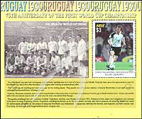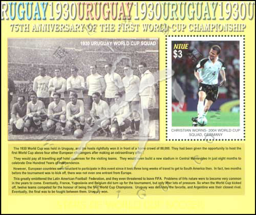 乌拉圭举办首届世界杯足球赛75周年,德国足球运动员克里斯蒂安·沃恩斯及乌拉圭足球队全家福小型张