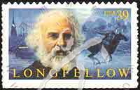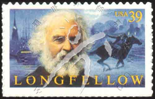 美国文学艺术系列—诗人朗费罗,肖像及其作品《保罗·里维尔骑马来》中的场景不干胶自贴票1全