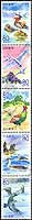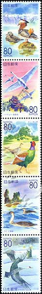 故乡邮票—中国地区五县的县鸟,鸳鸯及大山、白天鹅及松江城、莺及三大名园之一的后乐园、阿比鸟及鸣鹤5联