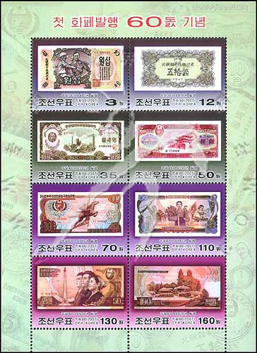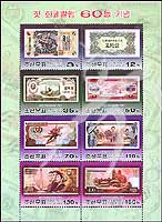 朝鲜货币流通60周年,各时期及各种面值的朝鲜货币小版张(8票)
