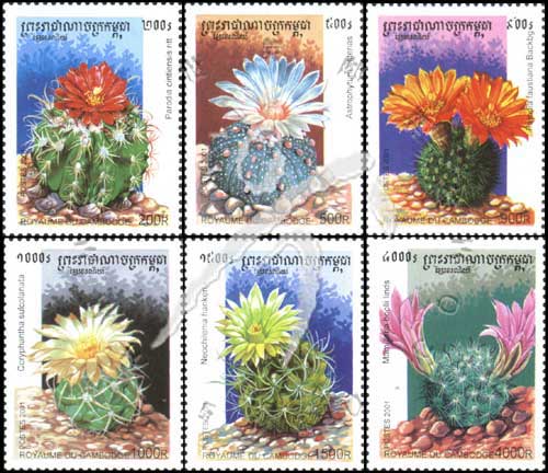 邮票介绍:仙人掌,轮冠仙人掌、星球、绯丽球、菠萝球、智利球及银毛球6全