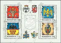 罗马尼亚城市徽章,摩尔达维亚、瓦拉几亚、特兰西瓦尼亚及布加勒斯特地区的城市徽章小全张(4票)