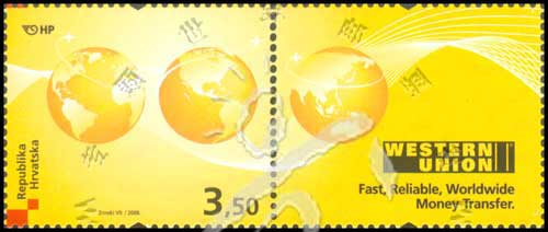 商务邮票—西联汇款,地球及西联标志带附票1全