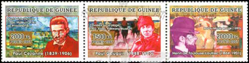 邮票介绍:著名印象派画家,画家保罗·塞尚、保罗·高更及亨利·德·图卢兹-洛特雷克3联(我社已售缺)