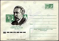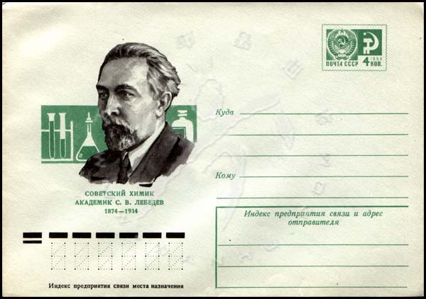 苏化学家列卡捷夫(1874-1934)诞生百年,肖像及化学试验器皿邮资封1全