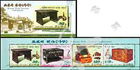 民俗家具,雕刻花纹的桌子、火锅、镶嵌珠宝的砚台、毛笔、红漆木盒、笔筒、首饰盒、耳环及戒指小本票(4票)