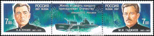俄罗斯著名海军将领,潜水员H.A.卢宁(1907-1970)及M.I.噶得日耶夫(1907-1942)诞生百年2全(带1枚过桥票为海军军舰)
