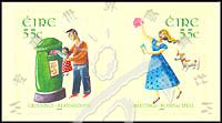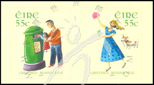 问候邮票,寄信的父女及收信的女人不干胶自贴票2联