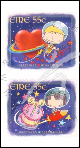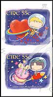 邮票介绍:问候邮票,带着爱心及蛋糕飞向太空的小孩不干胶自贴票2联