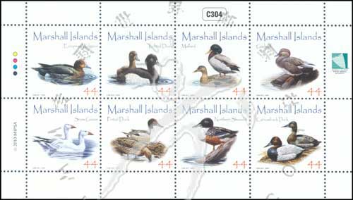 禽类,赤颈鸭、凤头潜鸭、野鸭、赤膀鸭、雪雁、针尾鸭、北方琵嘴鸭及帆背潜鸭小版张(8票)