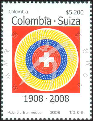 哥伦比亚与瑞士建交百年,两国国旗组合图案高面值票1全