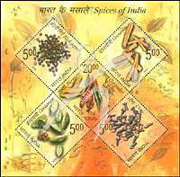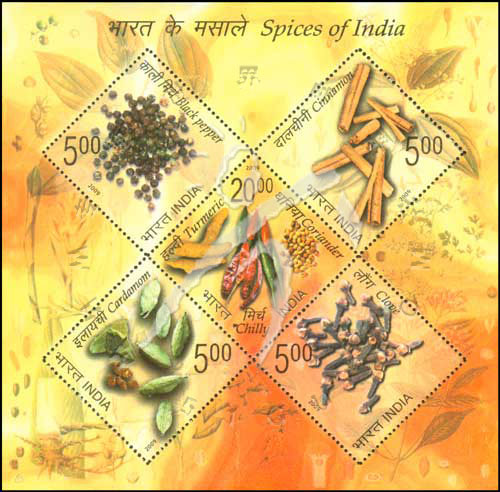 印度调料,黑胡椒、肉桂、芫荽、朝天椒、姜黄及小豆蔻菱形票小全张(5票)