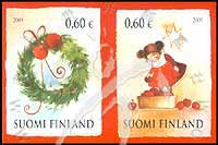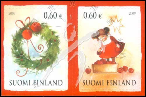 圣诞节,圣诞花环及捡苹果的小女孩不干胶自贴票2联