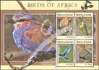 非洲鸟类,金翅雀、橘红长爪鹡鸰、家燕及纳马夸沙鸡小版张(4票)