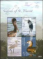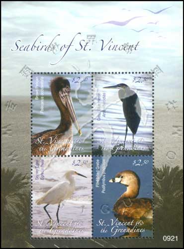 海鸟,褐鹈鹕、大蓝鹭、雪鹭及 斑嘴巨鸊鷉小版张(4票)