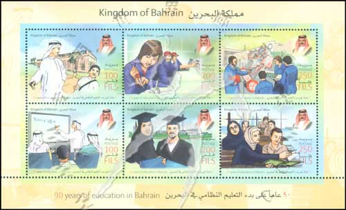 巴林教育事业90周年,哈里发亲王头像、教师授课、学生做实验及学生作业等教学活动小版张(6票)