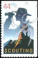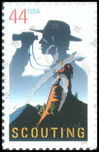 美国童子军百年,手持望远镜及登上山顶的童子军不干胶自贴票1全