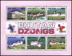 汉诺威2000年世博会系列二,不丹的“宗”(不丹分许多区,相当于中国的省,每个区都有一座主庙,称为“宗”,或称政都寺院)小版张(6票)