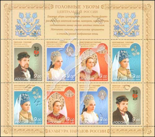 民族头饰,少女头饰、新娘头饰、妇女头饰及男子帽子小版张(2套共8票)