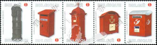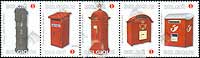新旧邮筒,19世纪古老铸铁邮筒、19世纪下半叶乡间使用的邮筒、1930年左右的立式邮筒及2001开始启用的新式邮筒等5联