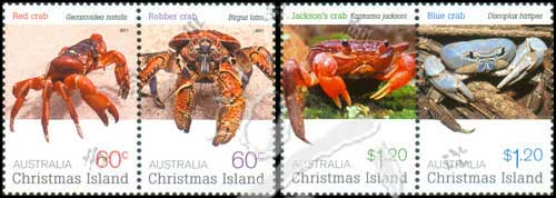 邮票介绍:圣诞岛的螃蟹,陆地红蟹、椰子蟹、杰克逊蟹及毛足圆盘蟹4全
