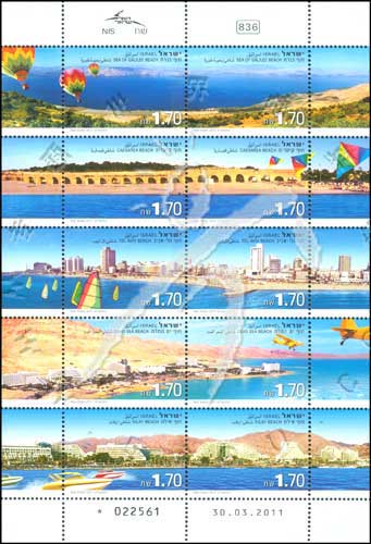 以色列海滩,特拉维夫海滩、死海海滩、埃拉特海滩、加利利海滩及凯撒利亚海滩小版张(10票)